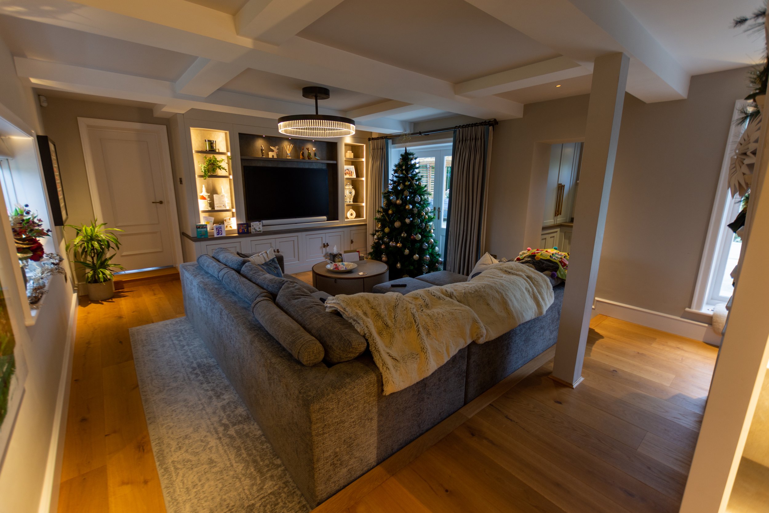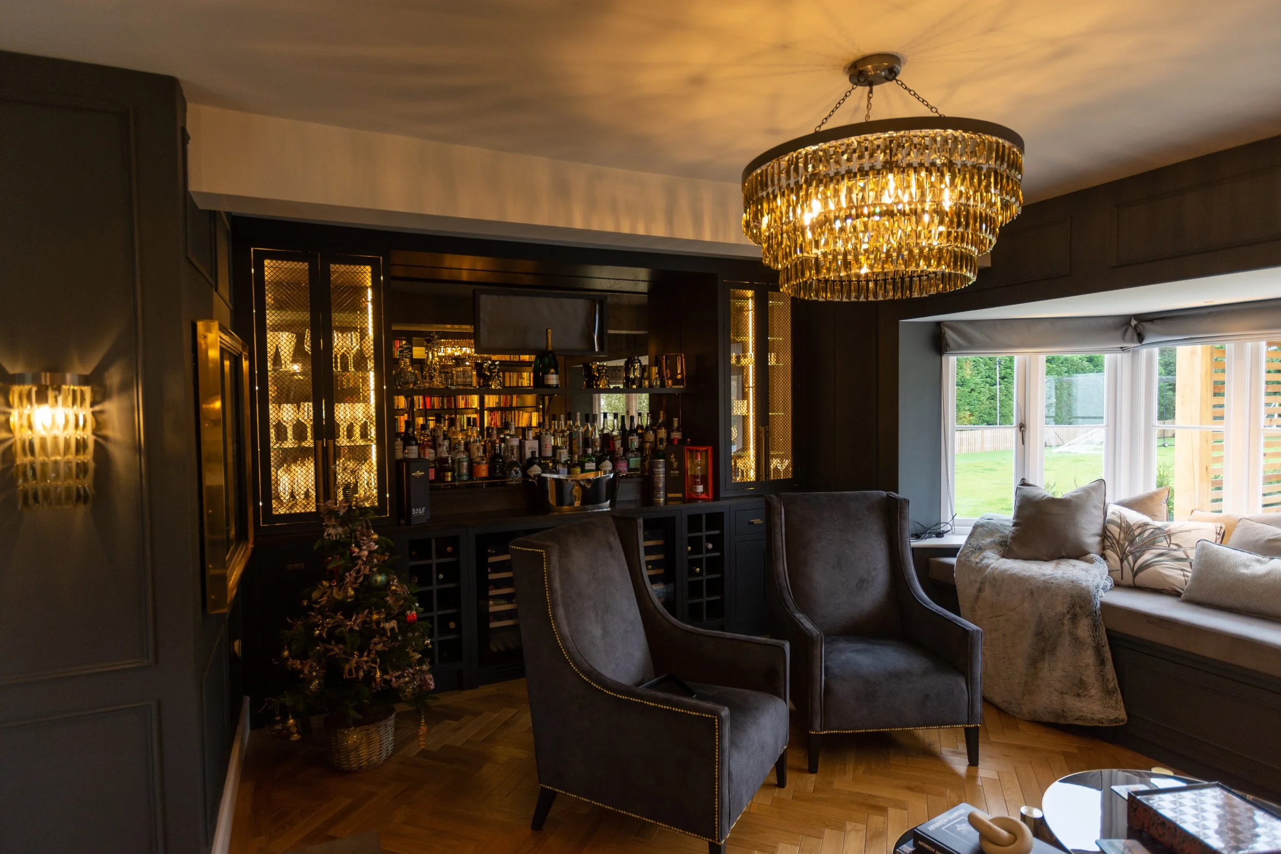 A bespoke entertainment room was implemented to one wing of the house with a full parquet flooring throughout featuring a full bar and drinks storage area, pool table, integrated bookcases and a custom seating area fitted to the existing bay window looking out over the garden area, all of which featured ambient LED lighting.