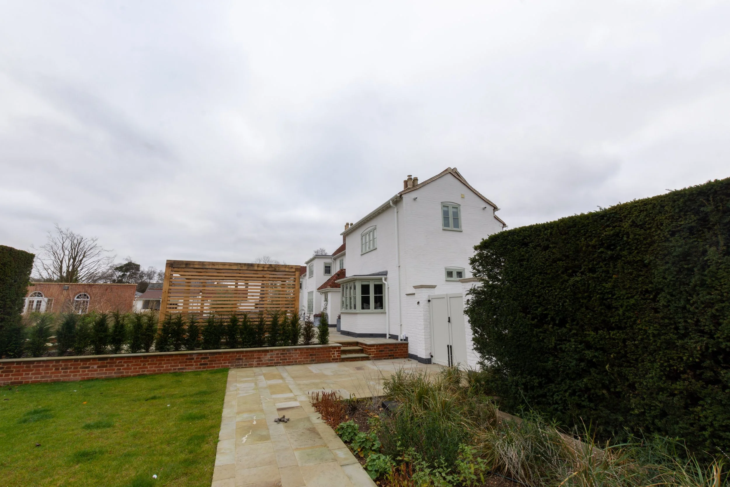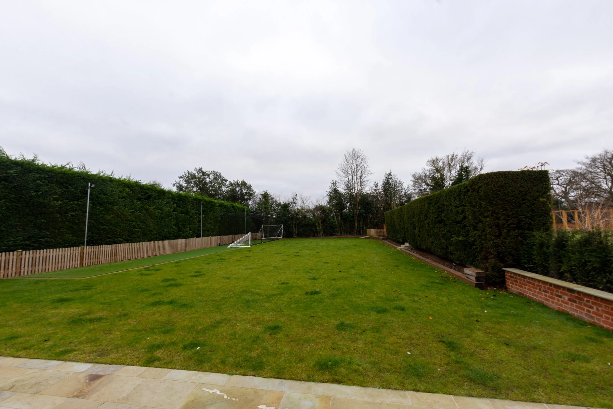 The garden was again stripped back and redesigned to feature numerous new trees, flowerbeds, square pathways and patio area housing an outdoor kitchen and seating area. The original external garden walls were retained and repaired where necessary and a small football and cricket pitch were installed.